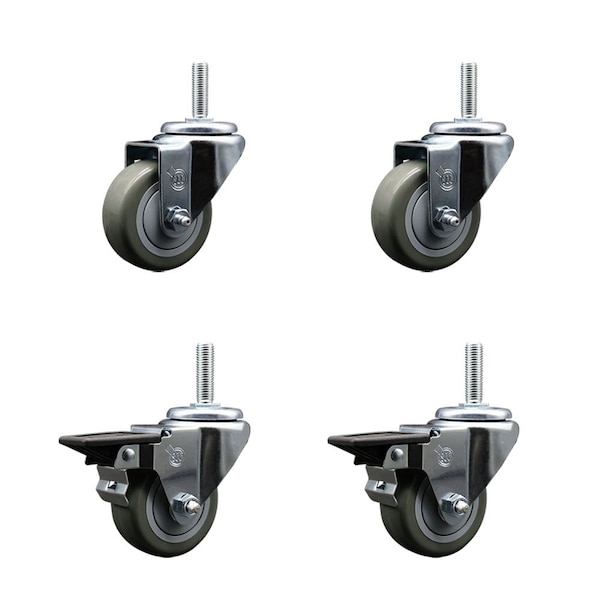 Listing is for a set of four 4 Service Caster Series 20 casters, two 2 swivel 58 threaded stem with brake casters and two 2 swivel casters, with 3 diameter by 114 wide gray polyurethane wheels Supports a total weight of 1,200lbs 300lbsper caster When searching for a reliable and durable solution to your caster needs, consider Service Casters Series 20 threaded stem polyurethane casters The Service Caster Series 20 is ideal for light and medium duty material handling, carts, equipment, and shop projects The bolt hole can accept a bolt or a customized stem, allowing for any type of mounting requirementThe zinc plated finish provides durability under any condition, while the nonmarking, nonmarring polyurethane wheels perform especially well on hard surfaces such as concrete, tile, and wood All rolling on a finely crafted ball bearing design that will keep you moving forward