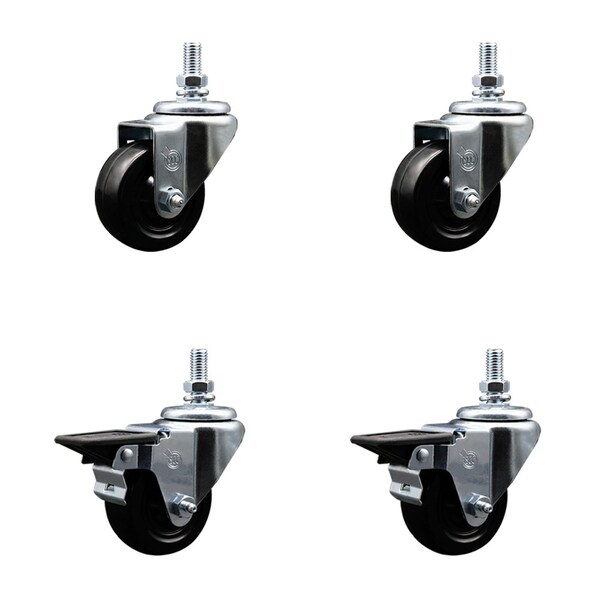 3 Inch Hard Rubber 12 Inch Threaded Stem Caster Set 2 Brakes SCC