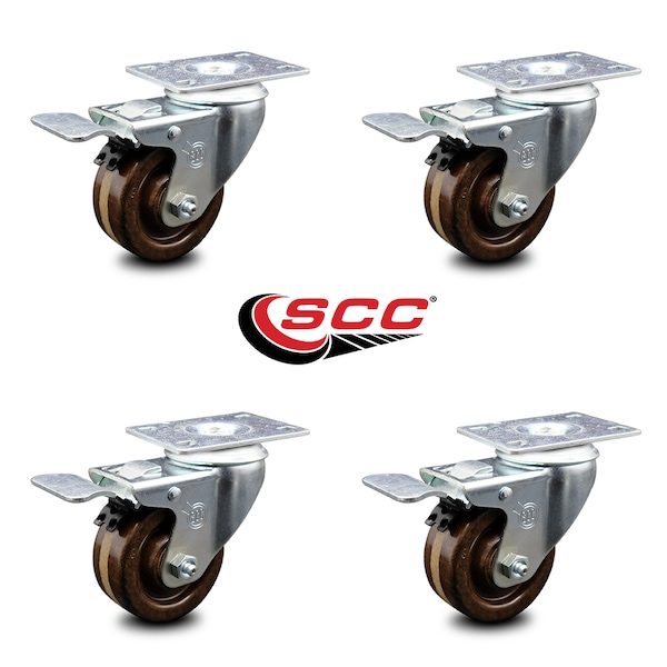 3 Inch High Temp Phenolic Swivel Top Plate Caster Set with Total Lock Brake SCC