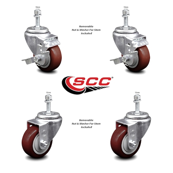 3 Inch Maroon Polyurethane Swivel 10mm Threaded Stem Caster Brakes SCC, 2PK