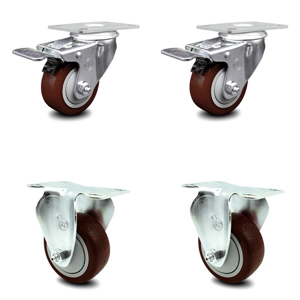 Listing is for a set of four (4) Service Caster Series #20 casters, two (2) swivel total lock brake casters and two (2) rigid casters, with 3” diameter by 1-1/4” wide maroon polyurethane wheels. Supports a total weight of 1,000lbs (250lbs/per caster).When searching for a reliable and durable solution to your caster needs, consider Service Caster’s Series 20 top plate polyurethane casters. The Service Caster Series #20 is ideal for light and medium duty material handling, carts, equipment, and shop projects. The bolt hole can accept a bolt or a customized stem, allowing for any type of mounting requirement. The zinc plated finish provides durability under any condition, while the non-marking, non-marring polyurethane wheels perform especially well on hard surfaces such as concrete, tile, and wood. All rolling on a finely crafted ball bearing design that will keep you moving forward. Service Caster is unsurpassed in quality, reliability, and excellent customer service. Count on us to move you forward.