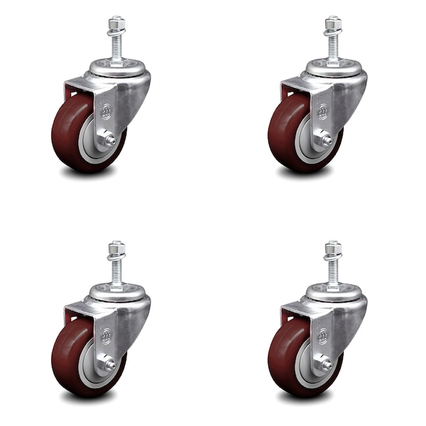 3 Inch Maroon Polyurethane Wheel Swivel 3/8 Inch Threaded Stem Caster Set SCC