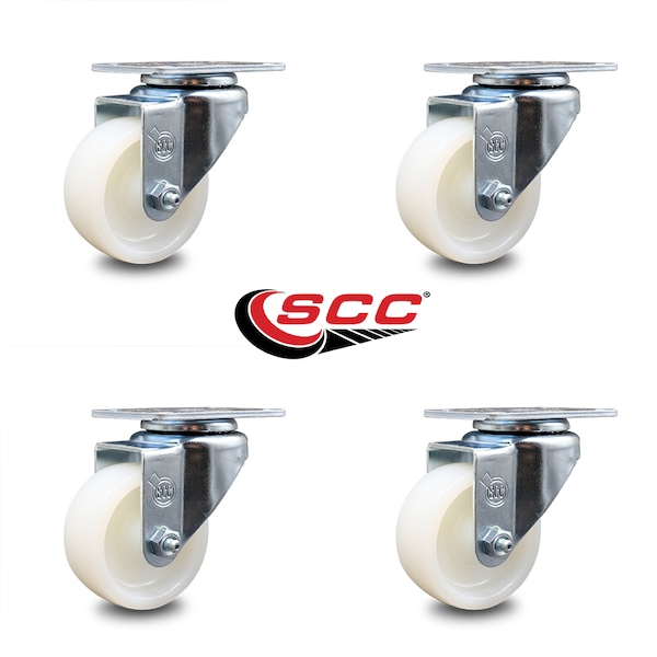 Listing is for a set of four (4) Service Caster Series #20 swivel casters, four (4) swivel casters with 3” diameter by 1-1/4” wide nylon wheels. Supports a total weight of 1,200lbs (300lbs/per caster). When searching for a reliable and durable solution to your caster needs, consider Service Caster Series 20 top plate nylon wheel casters. The Service Caster Series #20 is ideal for light and medium duty material handling, carts, equipment, and shop projects. The zinc plated finish provides durability under any condition, and the nylon wheels provide very low rolling resistance, show a high resistance to many aggressive substances, and are maintenance free under normal operating conditions. Not only are they resistant to most chemicals and oils, but they will be sure to keep you safely moving forward. Service Caster is unsurpassed in quality, reliability, and excellent customer service. Count on us to move you forward.