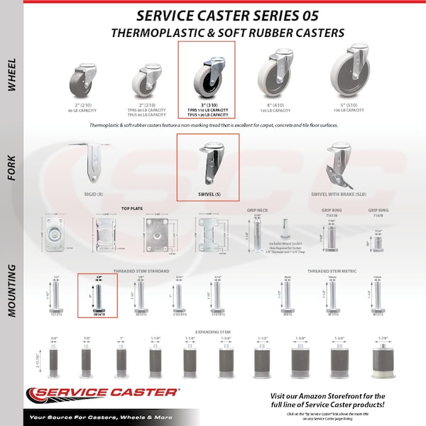 Listing is for a 3" diameter polyurethane wheel and a 3/8” diameter – 16 TPI x 1” threaded stem. Supports up to 120lbs. When searching for a reliable and durable solution to your furniture needs, consider Service Caster’s Series 05 polyurethane, thermoplastic & soft rubber casters. The Service Caster 05 series is ideal for light duty applications, and is the perfect solution as new or replacement parts for chairs, tables, medical carts and other home and office furniture. This durable caster provides easy maneuverability for a smooth and quiet ride, and features dual ball bearing heat treated raceway construction, with a zinc plated finish that provides durability under any condition. Wheels are available in non-marking polyurethane, thermoplastic rubber and soft rubber, excellent for carpet, concrete and tile floor surfaces. Mounting options include top plate, grip neck, grip ring and standard and metric threaded stem sizes. Also, the innovative expanding stem, that can easily adapt to the inside diameter of an opening, allowing for a secure fit in round or square tubes.