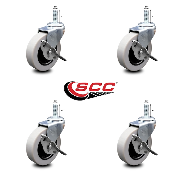 3 Inch Polyurethane Wheel 3/8 Threaded Stem Caster Set with Brakes SCC, 4PK