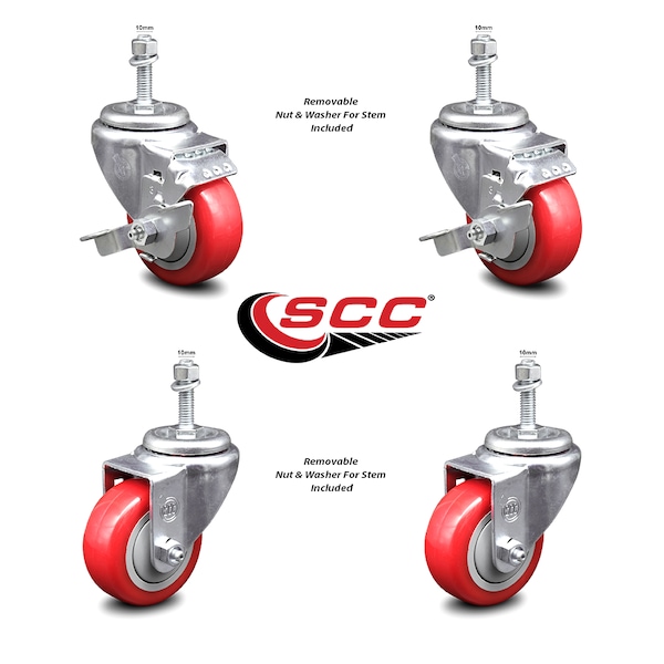 Listing is for a set of four (4) Service Caster Series #20 casters, two (2) swivel 10mm metric threaded stem with brake casters and two (2) swivel casters, with 3” diameter by 1-1/4” wide red polyurethane wheels. Supports a total weight of 1,000lbs (250lbs/per caster).When searching for a reliable and durable solution to your caster needs, consider Service Caster’s Series 20 threaded stem polyurethane casters. The Service Caster Series #20 is ideal for light and medium duty material handling, carts, equipment, and shop projects. The bolt hole can accept a bolt or a customized stem, allowing for any type of mounting requirement. The zinc plated finish provides durability under any condition, while the non-marking, non-marring polyurethane wheels perform especially well on hard surfaces such as concrete, tile, and wood. All rolling on a finely crafted ball bearing design that will keep you moving forward. Service Caster is unsurpassed in quality, reliability, and excellent customer service. Count on us to move you forward.