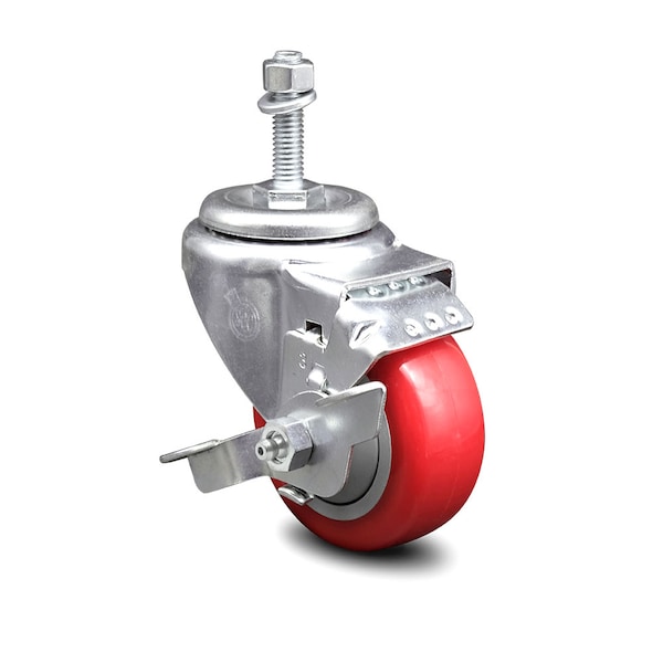 Listing is for one (1) Service Caster Series #20 swivel caster with a 3" diameter by 1-1/4" wide red polyurethane wheel and a 10mm metric threaded stem with a brake capable of supporting 250 lbs./caster.When searching for a reliable and durable solution to your caster needs, consider Service Caster’s Series 20 threaded stem polyurethane casters. The Service Caster Series #20 is ideal for light and medium duty material handling, carts, equipment, and shop projects. The bolt hole can accept a bolt or a customized stem, allowing for any type of mounting requirement. The zinc plated finish provides durability under any condition, while the non-marking, non-marring polyurethane wheels perform especially well on hard surfaces such as concrete, tile, and wood. All rolling on a finely crafted ball bearing design that will keep you moving forward. Service Caster is unsurpassed in quality, reliability, and excellent customer service. Count on us to move you forward.