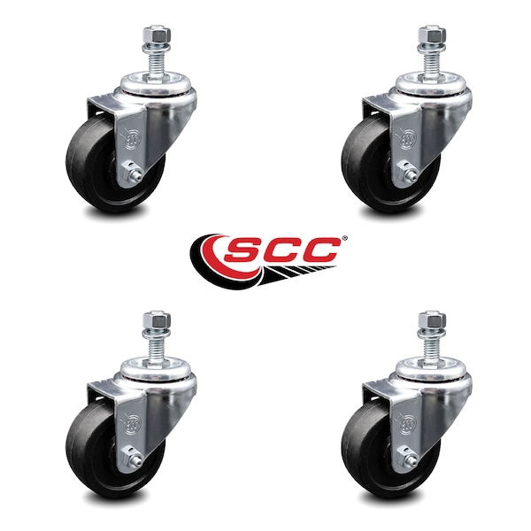 3 Inch Soft Rubber Wheel Swivel 3/8 Inch Threaded Stem Caster Set