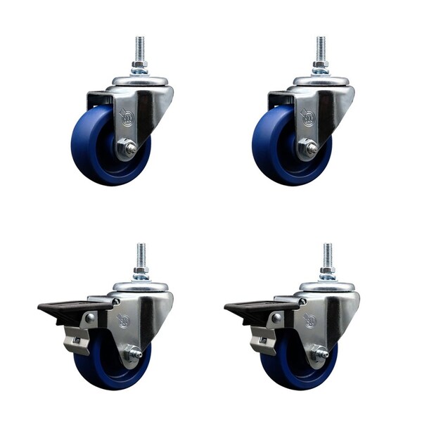3 Inch Solid Polyurethane 12 MM Threaded Stem Caster Set 2 Brakes SCC