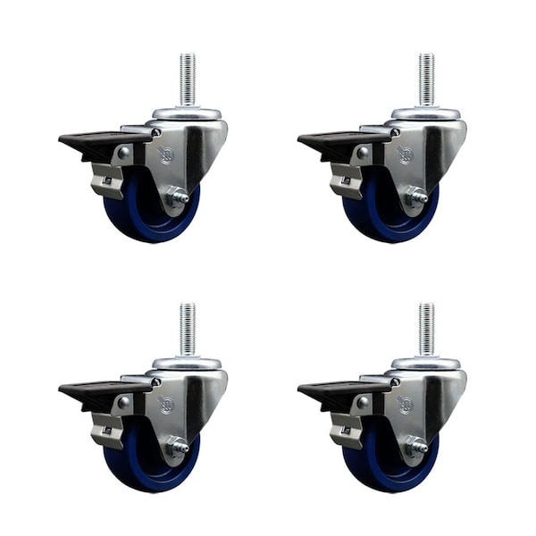 3 Inch Solid Polyurethane Wheel Swivel 34 Inch Threaded Stem Caster Set with Brake SCC
