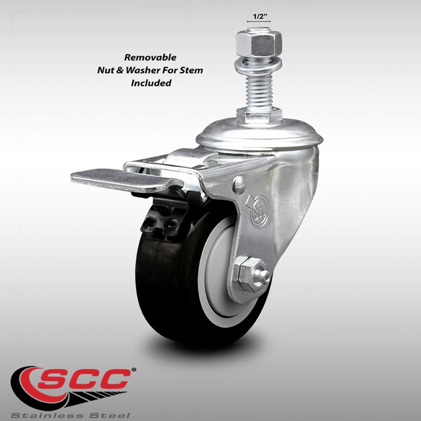 3 Inch SS Black Polyurethane 1/2 Inch Threaded Stem Caster with Total Lock Brake