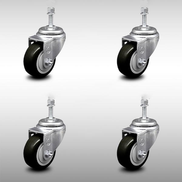 3 Inch SS Black Polyurethane Wheel Swivel 10mm Threaded Stem Caster Set SCC