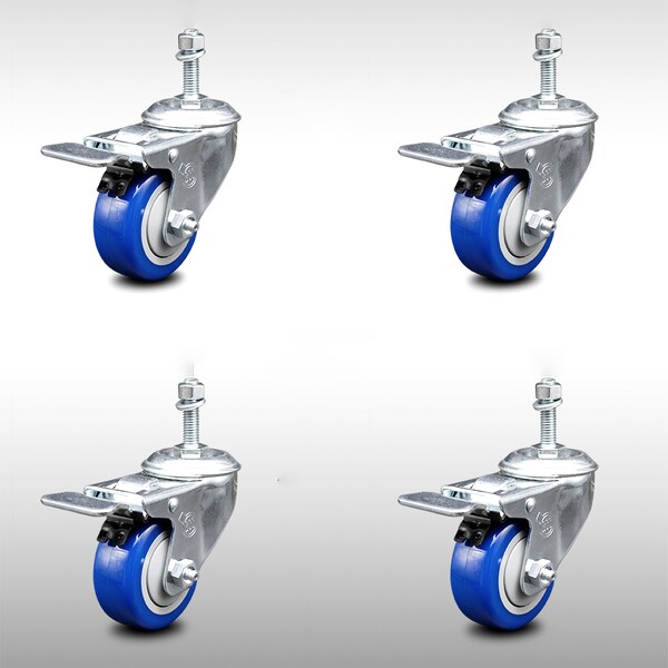 3 Inch SS Blue Polyurethane 3/8 Inch Threaded Stem Caster Set Total Lock Brake