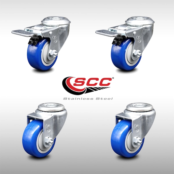 3 Inch SS Blue Polyurethane Swivel Bolt Hole Caster Set with 2 Total Lock Brake