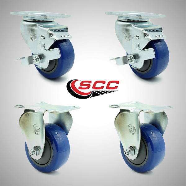 3 Inch SS Blue Polyurethane Top Plate Caster Set with 2 Brake 2 Rigid SCC