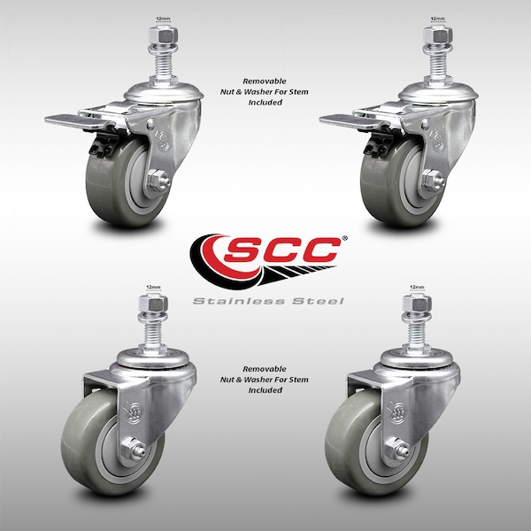 3 Inch SS Gray Polyurethane 12mm Threaded Stem Caster Total Lock Brake, 2PK