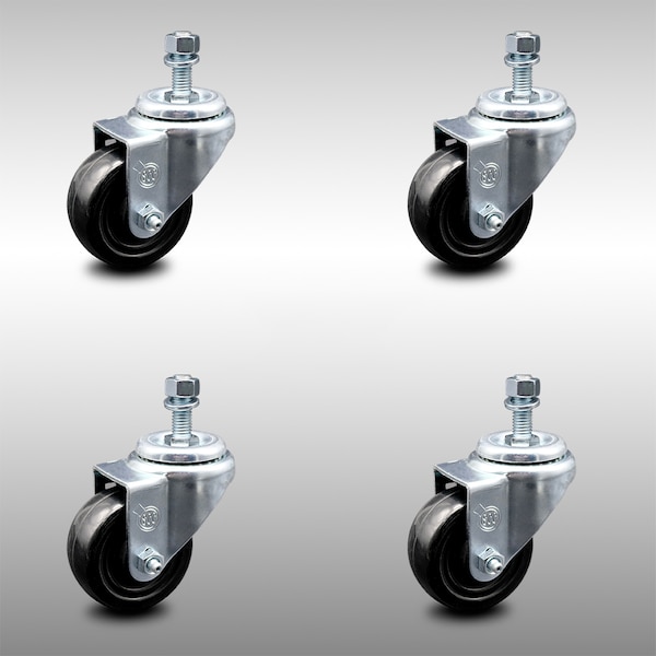 3 Inch SS Hard Rubber Wheel Swivel 10mm Threaded Stem Caster Set SCC