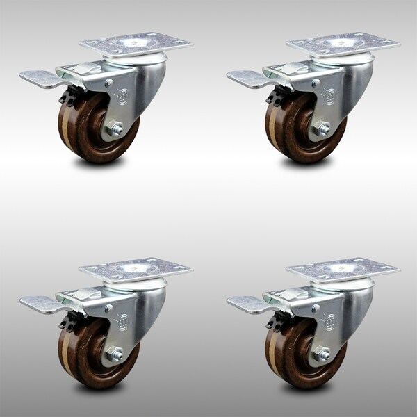3 Inch SS High Temp Phenolic Top Plate Caster Set Total Lock Brake SCC