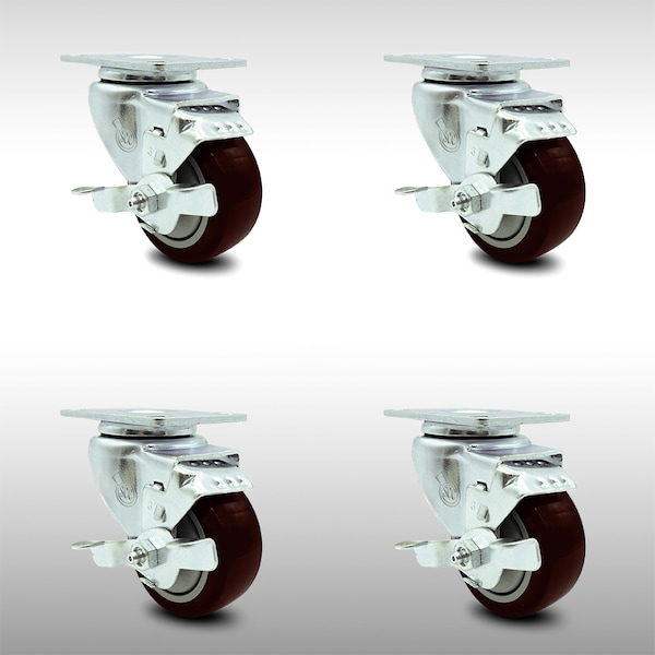 3 Inch SS Maroon Polyurethane Swivel Top Plate Caster Set with Brake SCC