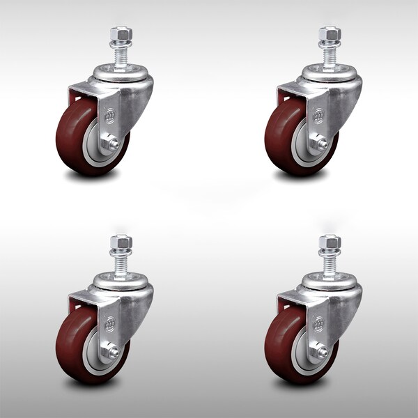 3 Inch SS Maroon Polyurethane Wheel Swivel 1/2 Inch Threaded Stem Caster Set SCC