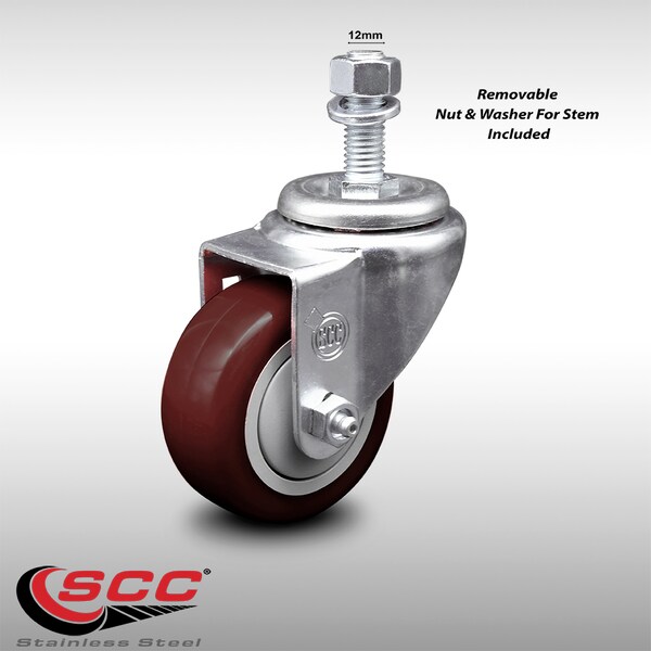 Listing is for one (1) Service Caster Series #20 stainless steel swivel caster with a 3" diameter by 1-1/4" wide maroon polyurethane wheel and a 12mm-1.75 X 1-1/2" metric threaded stem capable of supporting 250 lbs./caster.When searching for a reliable and durable solution to your caster needs, consider Service Caster’s Series 20 stainless steel threaded stem polyurethane casters. The Service Caster Series #20 is ideal for light and medium duty material handling, carts, equipment, and shop projects. The threaded stem is available in standard or metric sizes and ensures a solid and secure attachment. The polished stainless steel finish provides durability under any condition, while the non-marking, non-marring polyurethane wheels perform especially well on hard surfaces such as concrete, tile, and wood. All rolling via a finely crafted ball bearing design that will keep you moving forward. Service Caster is unsurpassed in quality, reliability, and excellent customer service. Count on us to move you forward.