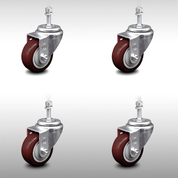 3 Inch SS Maroon Polyurethane Wheel Swivel 3/8 Inch Threaded Stem Caster Set SCC