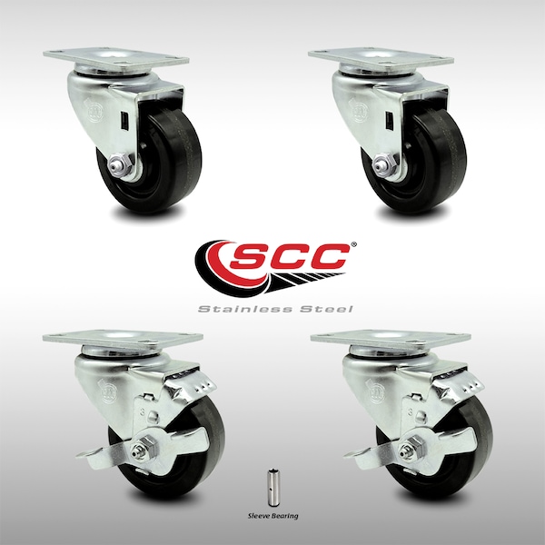 3 Inch SS Phenolic Swivel Top Plate Caster Set with 2 Brakes