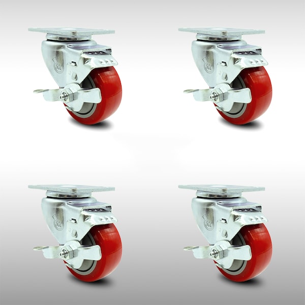 3 Inch SS Red Polyurethane Swivel Top Plate Caster Set with Brake SCC