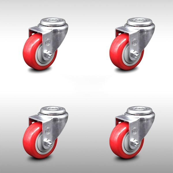 3 Inch SS Red Polyurethane Wheel Swivel Bolt Hole Caster Set