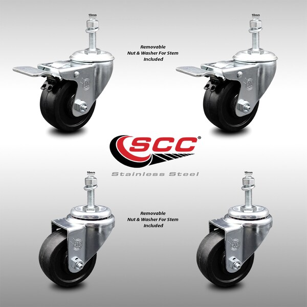 3 Inch SS Soft Rubber 10mm Threaded Stem Caster Total Lock Brake SCC, 2PK