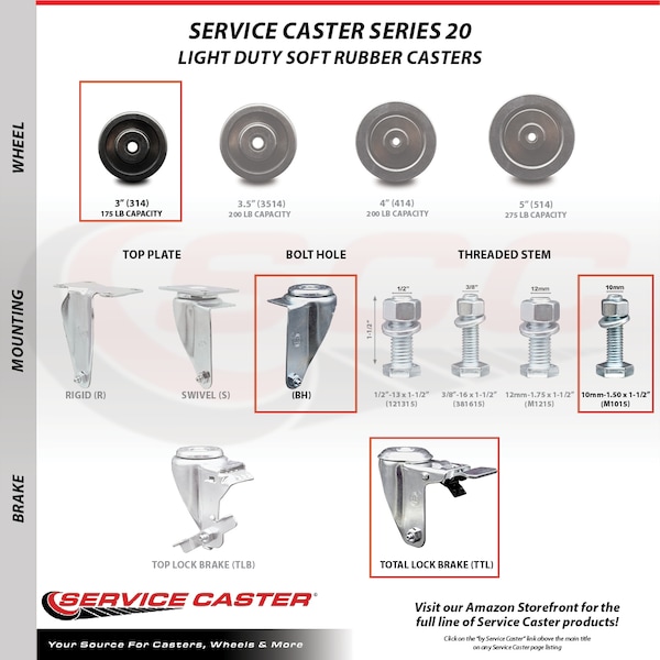 Listing is for one (1) Service Caster Series #20 stainless steel swivel caster with a 3" diameter by 1-1/4" wide soft rubber wheel and a 10mm-1.50 X 1-1/2" metric threaded stem with total lock brake capable of supporting 175 lbs./caster.When searching for a reliable and durable solution to your caster needs, consider Service Caster’s Series 20 stainless steel soft rubber casters. The Service Caster Series #20 is ideal for light and medium duty material handling, carts, equipment, and shop projects. The soft rubber wheels- resistant to most chemicals and oils- combine a soft tread on a hard rubber core, offering quiet movement and a cushioned ride. In contrast to the zinc plated caster, the luxuriously polished stainless steel finish resists rust and corrosion in indoor or outdoor applications where moisture is a factor. Mounting options include top plate, bolt hole and standard and metric threaded stem sizes. Service Caster is unsurpassed in quality, reliability, and excellent customer service. Count on us to move you forward.