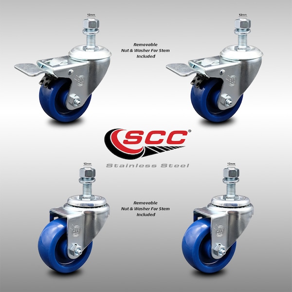 3 Inch SS Solid Poly 12mm Threaded Stem Caster Total Lock Brake SCC, 2PK