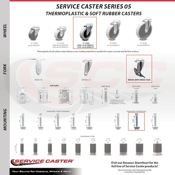 Listing is for a 3" diameter thermoplastic rubber wheel and a 10mm diameter – 1.5 TPI x 1.5” threaded stem with a side lock brake. Supports up to 110lbs. When searching for a reliable and durable solution to your furniture needs, consider Service Caster’s Series 05 polyurethane, thermoplastic & soft rubber casters. The Service Caster 05 series is ideal for light duty applications, and is the perfect solution as new or replacement parts for chairs, tables, medical carts and other home and office furniture. This durable caster provides easy maneuverability for a smooth and quiet ride, and features dual ball bearing heat treated raceway construction, with a zinc plated finish that provides durability under any condition. Wheels are available in non-marking polyurethane, thermoplastic rubber and soft rubber, excellent for carpet, concrete and tile floor surfaces. Mounting options include top plate, grip neck, grip ring and standard and metric threaded stem sizes. Also, the innovative expanding stem, that can easily adapt to the inside diameter of an opening, allowing for a secure fit in round or square tubes.