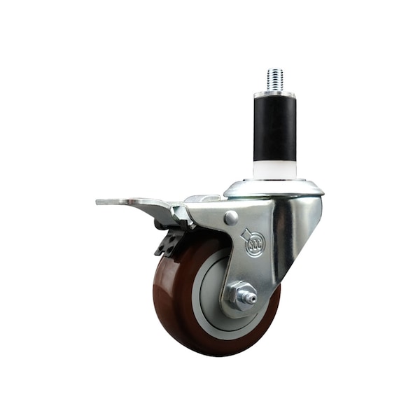 Listing is for one 1 Service Caster Series #20 1-3/8'' expanding stem swivel caster with a 3'' diameter by 1-1/4'' wide maroon polyurethane wheel and a total locking brake capable of supporting 300 lbs./caster. When searching for a reliable and durable solution to your caster needs, look no further than the Service Caster Series 20 expanding stem maroon polyurethane wheel casters. The Series #20 features an innovative expanding stem that can easily adapt to the inside diameter of the opening, allowing for a secure fit in round or square tubes. Simply tighten the topmost knurled nut to compress the rubber for a snug fit. For added security, further compress the rubber with a wrench via the nut under the swivel raceway. Finely crafted with a bright zinc plated finish, heat-treated ball bearing raceway, and a maroon polyurethane wheel, this versatile caster is ideal for work tables, shop projects, or any equipment with round or square tube legs. Service Caster is unsurpassed in quality, reliability, and excellent customer service. Count on us to move you forward.