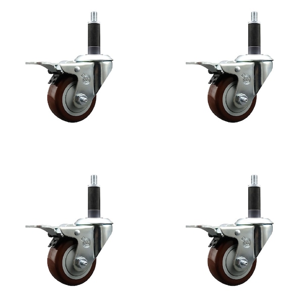 Listing is for a set of four 4 Service Caster Series #20 1'' expanding stem swivel casters with 3'' diameter by 1-1/4'' wide maroon polyurethane wheels and total locking brakes capable of supporting a total weight of 1,200 lbs. 300 lbs./caster.. When searching for a reliable and durable solution to your caster needs, look no further than the Service Caster Series 20 expanding stem maroon polyurethane wheel casters. The Series #20 features an innovative expanding stem that can easily adapt to the inside diameter of the opening, allowing for a secure fit in round or square tubes. Simply tighten the topmost knurled nut to compress the rubber for a snug fit. For added security, further compress the rubber with a wrench via the nut under the swivel raceway. Finely crafted with a bright zinc plated finish, heat-treated ball bearing raceway, and a maroon polyurethane wheel, this versatile caster is ideal for work tables, shop projects, or any equipment with round or square tube legs. Service Caster is unsurpassed in quality, reliability, and excellent customer service. Count on us to move you forward.