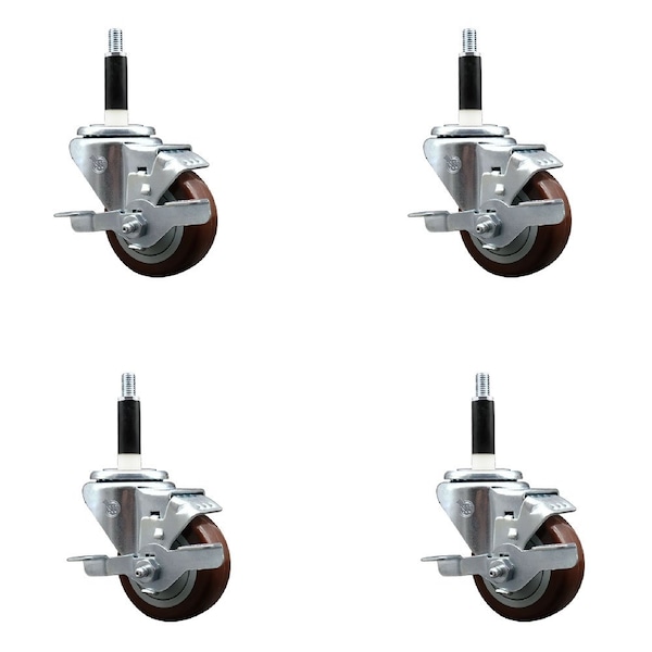 3'' Maroon Poly Swivel 7/8'' Expanding Stem Caster Set with Brake, 4PK