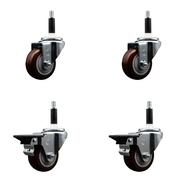 3'' Maroon Poly Wheel Swivel 7/8'' Expanding Stem Caster Set 2 Brakes, 4PK