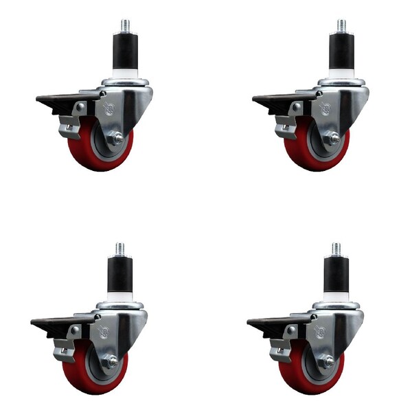 3'' Red Poly Swivel 1-1/2'' Expanding Stem Caster Set with Brake, 4PK