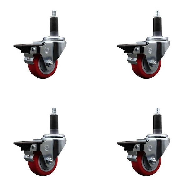 3'' Red Poly Swivel 1-1/8'' Expanding Stem Caster Set with Brake, 4PK