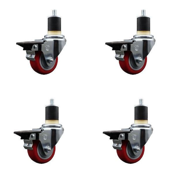 3'' Red Poly Swivel 1-7/8'' Expanding Stem Caster Set with Brake, 4PK