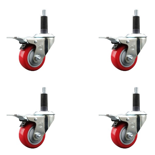 3'' Red Poly Swivel 1'' Expanding Stem Caster Set Total Lock Brake, 4PK