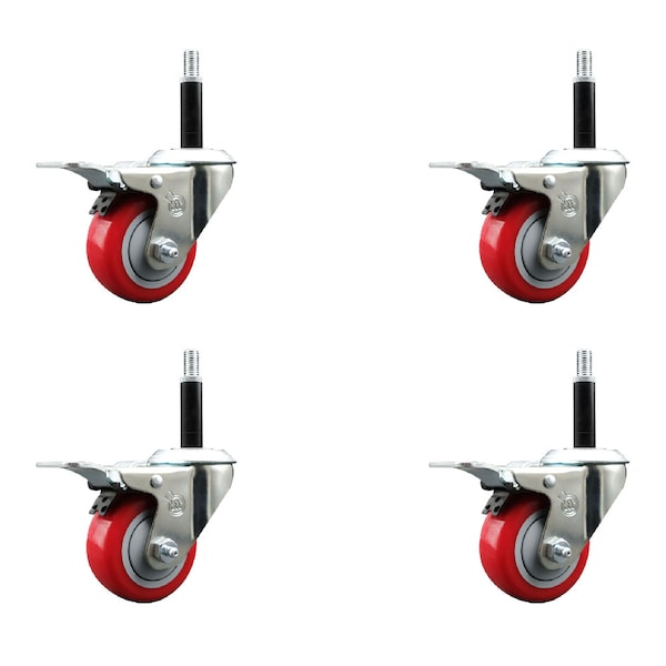 3'' Red Poly Swivel 3/4'' Expanding Stem Caster Set Total Lock Brake, 4PK
