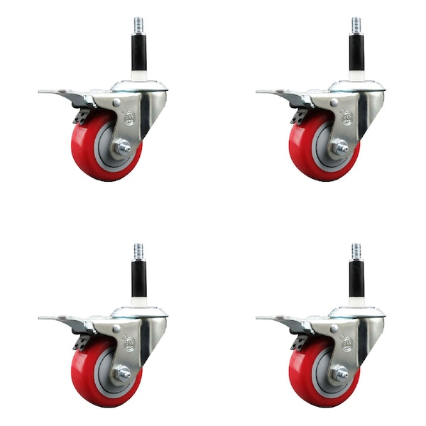 3'' Red Poly Swivel 7/8'' Expanding Stem Caster Set Total Lock Brake, 4PK
