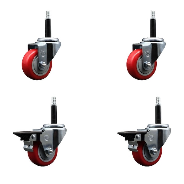 3'' Red Poly Wheel Swivel 3/4'' Expanding Stem Caster Set 2 Brakes, 4PK