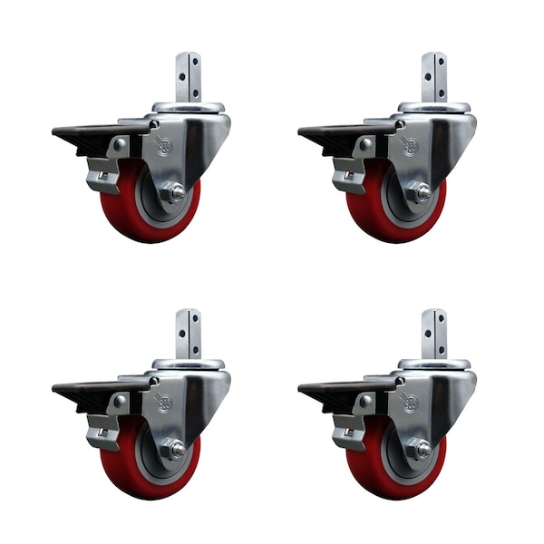 3'' Red Poly Wheel Swivel 3/4'' Square Stem Caster Set with Brake, 4PK