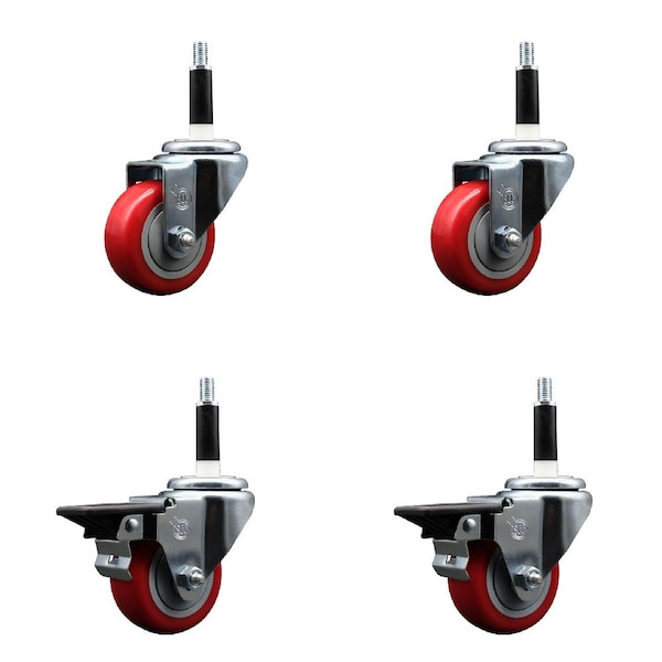 3'' Red Poly Wheel Swivel 7/8'' Expanding Stem Caster Set 2 Brakes, 4PK