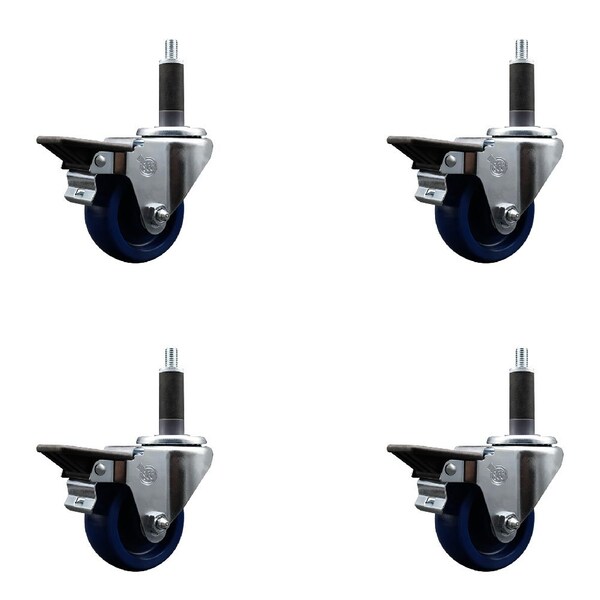 Listing is for a set of four 4 Service Caster Series #20 1'' expanding stem swivel casters with 3'' diameter by 1-1/4'' wide blue solid polyurethane wheels and posi locking brakes capable of supporting a total weight of 1,200 lbs. 300 lbs./caster.. When searching for a reliable and durable solution to your caster needs, look no further than the Service Caster Series 20 expanding stem solid polyurethane wheel casters. The Series #20 features an innovative expanding stem that can easily adapt to the inside diameter of the opening, allowing for a secure fit in round or square tubes. Simply tighten the topmost knurled nut to compress the rubber for a snug fit. For added security, further compress the rubber with a wrench via the nut under the swivel raceway. Finely crafted with a bright zinc plated finish, heat-treated ball bearing raceway, and a solid polyurethane wheel, this versatile caster is ideal for work tables, shop projects, or any equipment with round or square tube legs. Service Caster is unsurpassed in quality, reliability, and excellent customer service. Count on us to move you forward.