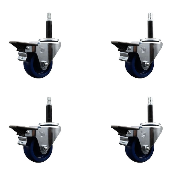 Listing is for a set of four 4 Service Caster Series #20 3/4'' expanding stem swivel casters with 3'' diameter by 1-1/4'' wide blue solid polyurethane wheels and posi locking brakes capable of supporting a total weight of 1,200 lbs. 300 lbs./caster.. When searching for a reliable and durable solution to your caster needs, look no further than the Service Caster Series 20 expanding stem solid polyurethane wheel casters. The Series #20 features an innovative expanding stem that can easily adapt to the inside diameter of the opening, allowing for a secure fit in round or square tubes. Simply tighten the topmost knurled nut to compress the rubber for a snug fit. For added security, further compress the rubber with a wrench via the nut under the swivel raceway. Finely crafted with a bright zinc plated finish, heat-treated ball bearing raceway, and a solid polyurethane wheel, this versatile caster is ideal for work tables, shop projects, or any equipment with round or square tube legs. Service Caster is unsurpassed in quality, reliability, and excellent customer service. Count on us to move you forward.