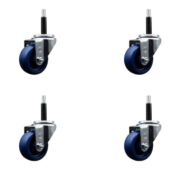 Listing is for a set of four 4 Service Caster Series #20 3/4'' expanding stem swivel casters with 3'' diameter by 1-1/4'' wide blue solid polyurethane wheels capable of supporting a total weight of 1,200 lbs. 300 lbs./caster.. When searching for a reliable and durable solution to your caster needs, look no further than the Service Caster Series 20 expanding stem solid polyurethane wheel casters. The Series #20 features an innovative expanding stem that can easily adapt to the inside diameter of the opening, allowing for a secure fit in round or square tubes. Simply tighten the topmost knurled nut to compress the rubber for a snug fit. For added security, further compress the rubber with a wrench via the nut under the swivel raceway. Finely crafted with a bright zinc plated finish, heat-treated ball bearing raceway, and a solid polyurethane wheel, this versatile caster is ideal for work tables, shop projects, or any equipment with round or square tube legs. Service Caster is unsurpassed in quality, reliability, and excellent customer service. Count on us to move you forward.