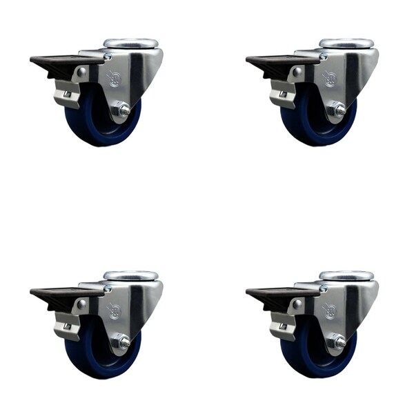 Listing is for a set of four 4 Service Caster Series #20 casters, four 4 swivel bolt hole casters with posi lock brakes, 3'' diameter by 1-1/4'' wide blue solid polyurethane wheels. Supports a total weight of 1,200lbs 300lbs/per caster. The Service Caster Series #20 is ideal for light and medium duty material handling, carts, equipment, and shop projects. The zinc plated finish provides durability under any condition. And the non-marking, non-marring polyurethane wheel is molded as one solid piece, making it free from debonding. This ensures the wheel will not flat spot, as can occur with comparable polyurethane wheels, resulting in a smooth and solid roll over long periods of time. Mounting options include top plate, bolt hole and standard and metric threaded stem sizes. Service Caster is unsurpassed in quality, reliability, and excellent customer service. Count on us to move you forward.